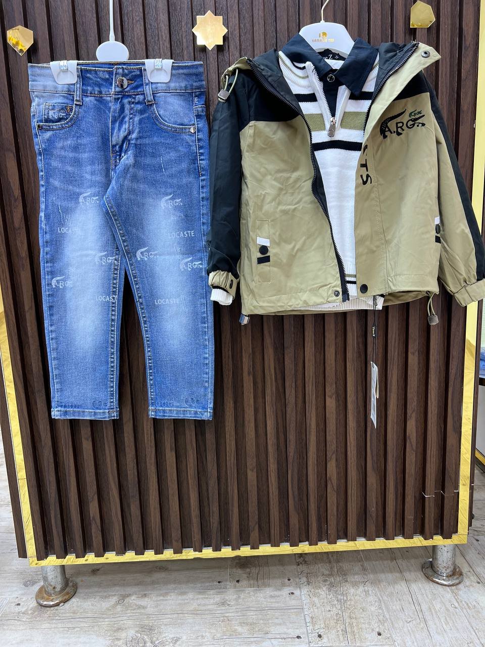 Ensemble garçon 4 pièces composé d’une veste à capuche zippée vert d’olive et noir, une chemise noir , d’un pull rayé blanc et d’un jean tendance. Tenue idéale pour enfant, alliant style moderne, confort et praticité pour un usage quotidien. Parfait pour les saisons fraîches, les sorties et l’école.